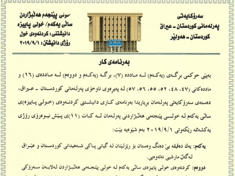 The Presidency of the Kurdistan Parliament announces the order of business for opening of the autumn session of Parliament, on Sunday 1st September 2019, at 11am.