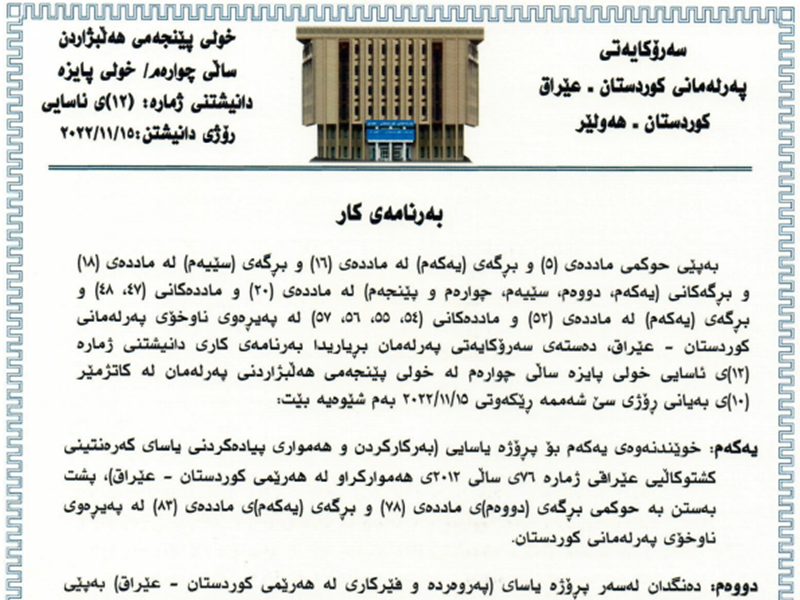The Kurdistan Parliament on 29 and 30 November 2022 held the second reading of the important Labour Bill, and voted several other bills into law, including the Law on the Protection of Animals. Soz Abdulqadir (Gorran) was sworn in as a new Member of Parliament, taking the place of Shayan Kaka Salih (Gorran) who resigned her seat.