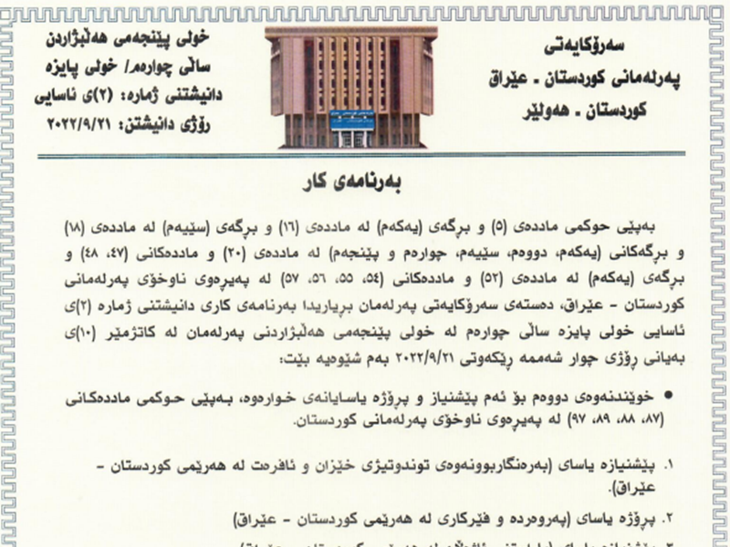 The Speaker of the Kurdistan Parliament Dr. Rewaz Faiq calls MPs to a sitting on Tuesday 27th September 2022 at 10am, the fourth ordinary sitting of the autumn session of the fourth year of the fifth term of Parliament. The Presidency of Parliament announces the order of business of the sitting as follows: