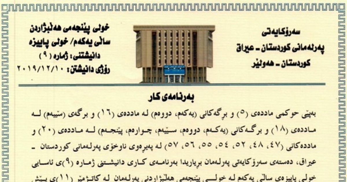 The Presidency of the Kurdistan Parliament announces the order of business for the sitting of Tuesday 10th December 2019 at 11 am – the ninth ordinary sitting of the autumn session of the first year of the Kurdistan Parliament’s fifth term:
