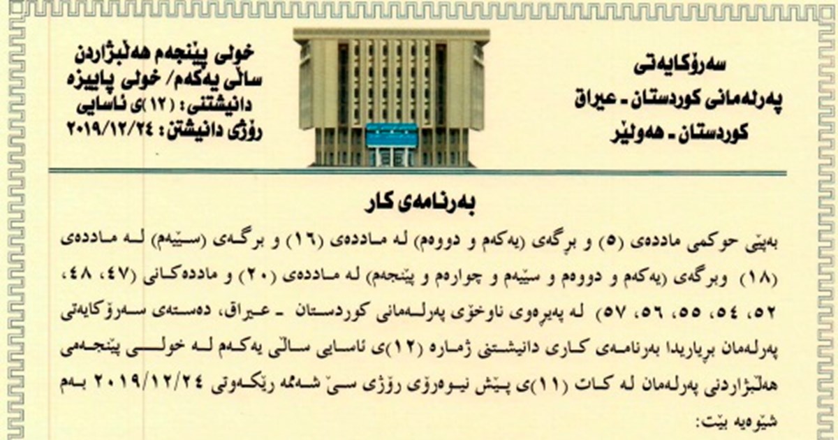 The Presidency of the Kurdistan Parliament announces the order of business for the sitting of Tuesday 24th December 2019 at 11 am – the 12th ordinary sitting of the autumn session of the first year of the Kurdistan Parliament’s fifth term: