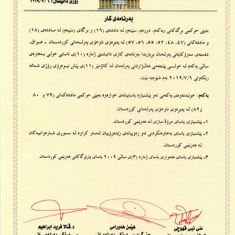 The Presidency of the Kurdistan Parliament announces the order of business for the fifth term’s tenth normal sitting on Saturday 6th July 2019, at 11am: