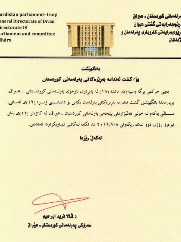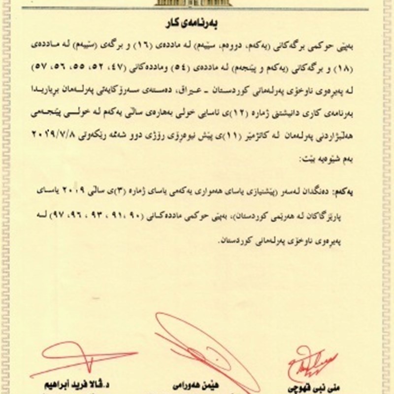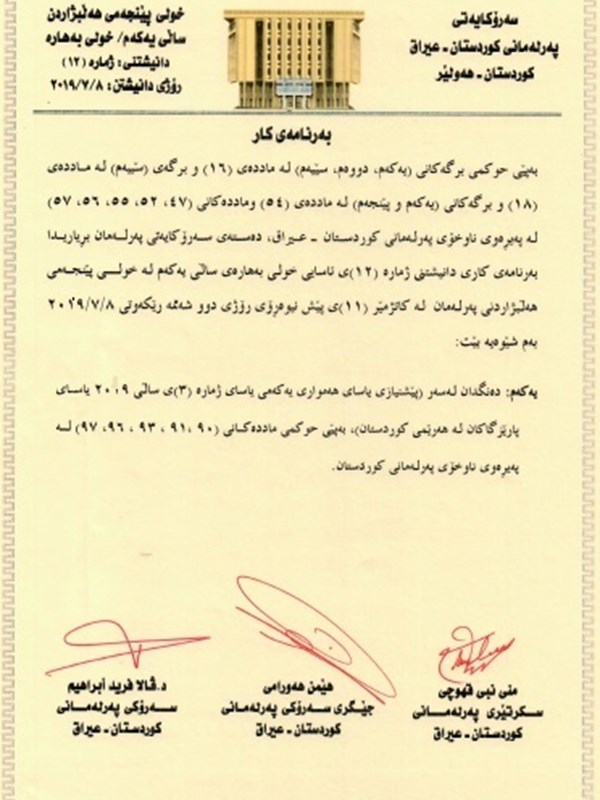 The Presidency of the Kurdistan Parliament announces the order of business for the fifth term’s 12th normal sitting on Monday 8th July 2019, at 11am: