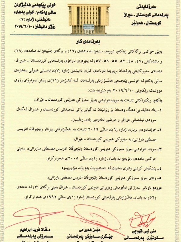 The Presidency of the Kurdistan Parliament announces the order of business for the fifth term’s seventh normal sitting on 10th June 2019 at 11am: