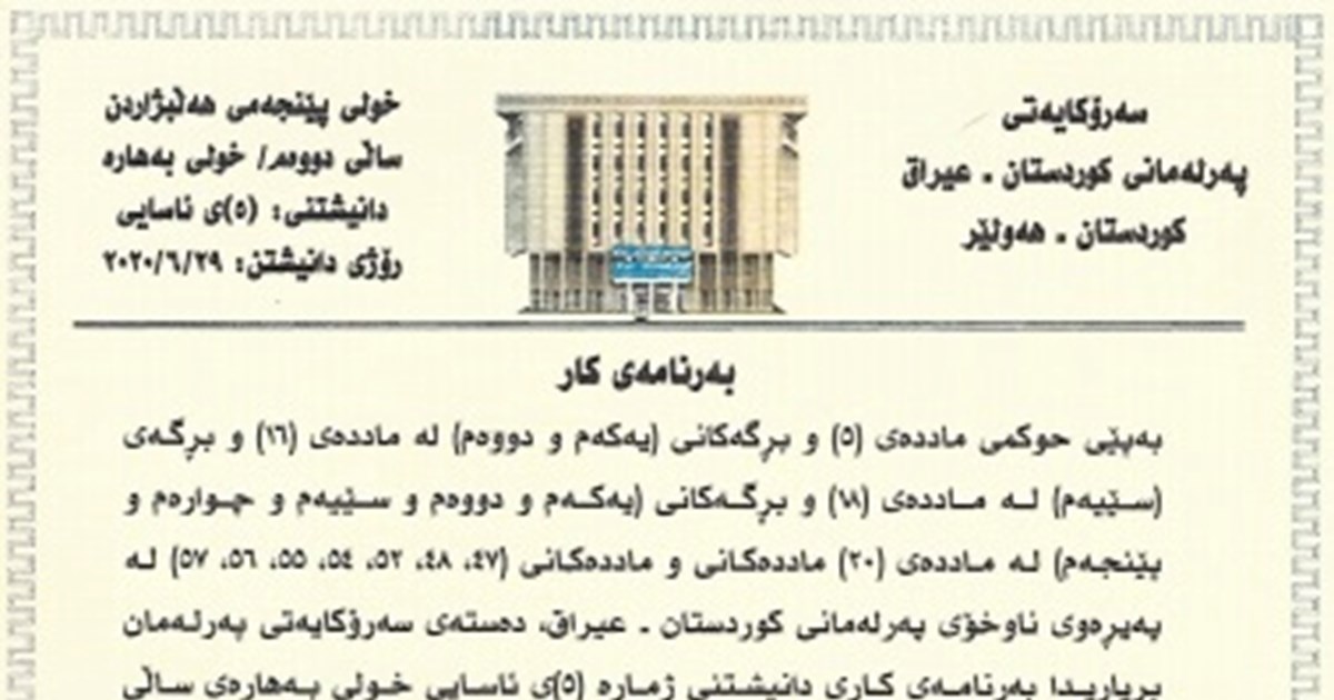 The Presidency of the Kurdistan Parliament announces this sitting according to Parliament’s Internal Rules of Procedure, Article 19 (paragraph 1) and Article 66 (paragraph 3), and with reference to the Kurdistan Parliament letter signed by the Speaker, number 1200 dated 16 July 2020, to the KRG Council of Ministers, which refers to the procedures for the Parliament sittings on 27th, 28th and 29th July 2020.