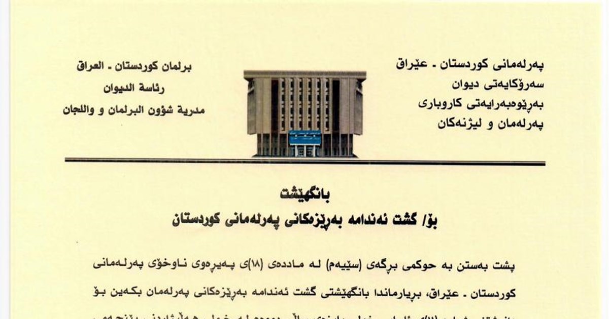 The Presidency of the Kurdistan Parliament decides and announces the order of business of this sitting according to Parliament’s Internal Rules of Procedure, Article 5, Article 16 (paragraphs 1, 2, 3), Article 18 (paragraph 3), Article 20 (paragraphs 1, 2, 3, 4, 5), and articles 47, 48, 52, 54, 55, 56 and 57.