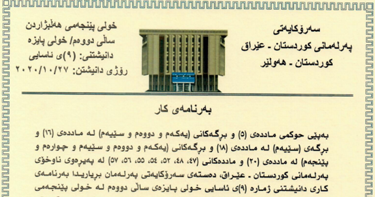 The Speaker of the Kurdistan Parliament calls MPs to a sitting on Monday 27th October 2020 at 2pm – the ninth ordinary sitting of the autumn session of the second year of the Kurdistan Parliament’s fifth term. The Presidency of Parliament announces the order of business of the sitting as follows:
