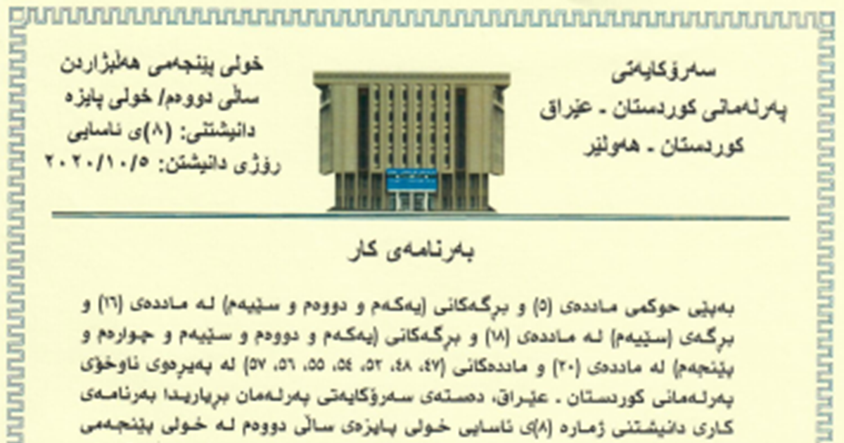 The Speaker of the Kurdistan Parliament calls MPs to a sitting on Monday 5th October 2020 at 10am – the eighth ordinary sitting of the autumn session of the second year of the Kurdistan Parliament’s fifth term. The Presidency of Parliament announces the order of business of the sitting as follows: