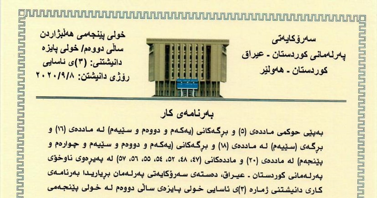 The Presidency of the Kurdistan Parliament announces the order of business for the sitting of Tuesday 8th September 2020 – the third ordinary sitting of the autumn session of the second year of the Kurdistan Parliament’s fifth term: