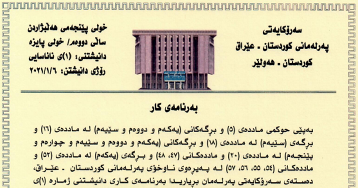 The Speaker of the Kurdistan Parliament calls MPs to the first extraordinary sitting of the third year of the fifth term of the Kurdistan Parliament on Wednesday 6th January 2021 at 11am, per Article 8 (paragraph 1) of Parliament’s Internal Rules of Procedure. The Presidency of Parliament announces the order of business of the sitting as follows: