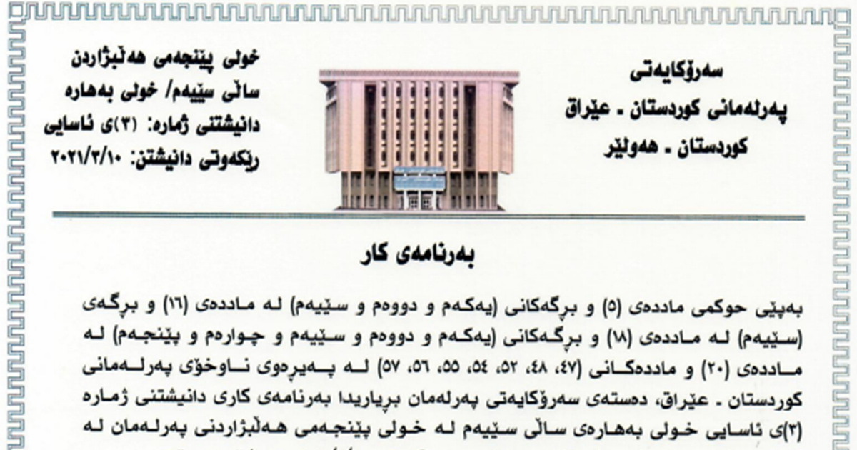 The Presidency of the Kurdistan Parliament decides and announces the order of business of this sitting according to Parliament’s Internal Rules of Procedure, Article 5, Article 16 (paragraph 1), Article 18 (paragraph 3), Article 20 (paragraphs 1, 2, 3, 4, 5), and articles 47, 48, 52, 54, 55, 56 and 57.