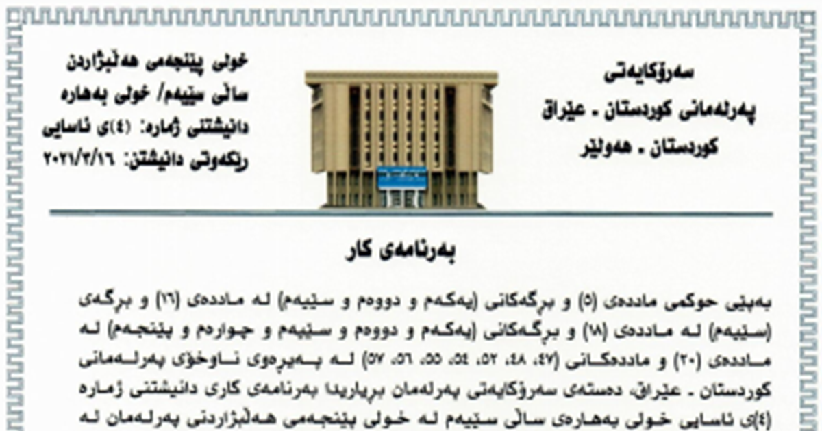 The Presidency of the Kurdistan Parliament decides and announces the order of business of this sitting according to Parliament’s Internal Rules of Procedure, Article 5, Article 16 (paragraph 1), Article 18 (paragraph 3), Article 20 (paragraphs 1, 2, 3, 4, 5), and articles 47, 48, 52, 54, 55, 56 and 57.