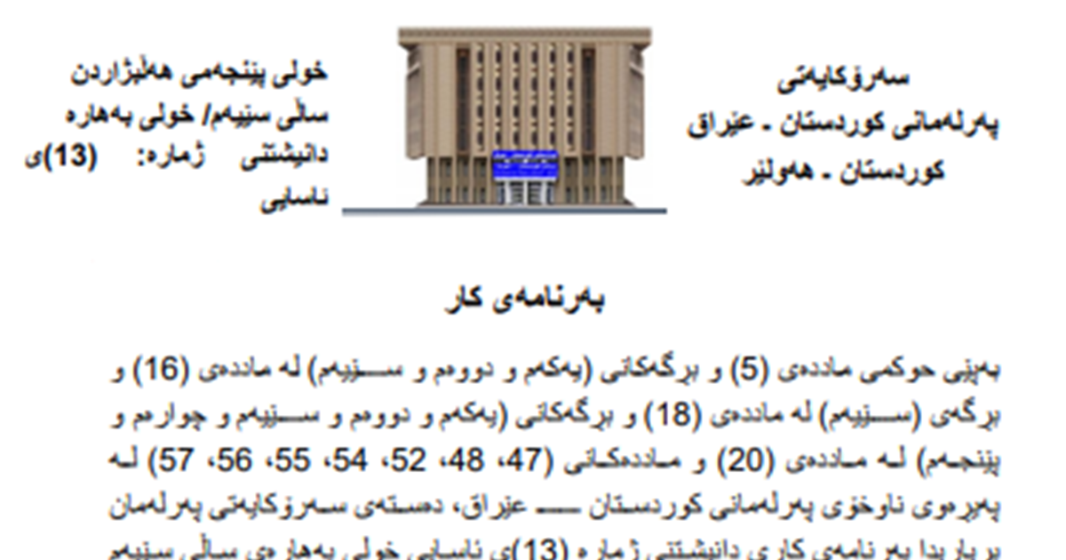 The Presidency of the Kurdistan Parliament decides and announces the order of business of this sitting according to Parliament’s Internal Rules of Procedure, Article 5, Article 16 (paragraph 1), Article 18 (paragraph 3), Article 20 (paragraphs 1, 2, 3, 4, 5), and articles 47, 48, 52, 54, 55, 56 and 57.