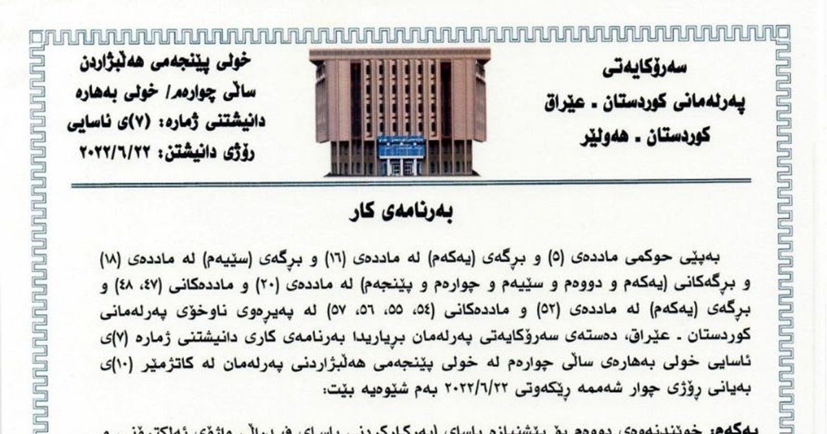The Presidency of the Kurdistan Parliament decides and announces the order of business of this sitting according to Parliament’s Internal Rules of Procedure, Article 5, Article 16 (paragraph 1), Article 18 (paragraph 3), Article 20 (paragraphs 1, 2, 3, 4, 5), articles 47 and 48, Article 52 (paragraph 1) and articles 54, 55, 56 and 57.