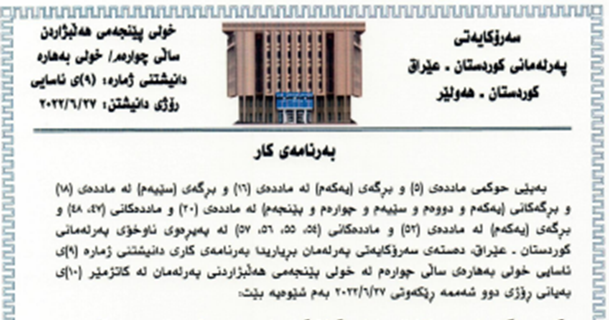 The Speaker of the Kurdistan Parliament Dr. Rewaz Faiq calls MPs to a sitting on Monday 27th June 2022 at 10am, the ninth ordinary sitting of the spring session of the fourth year of the fifth term of Parliament. The Presidency of Parliament announces the order of business of the sitting as follows: