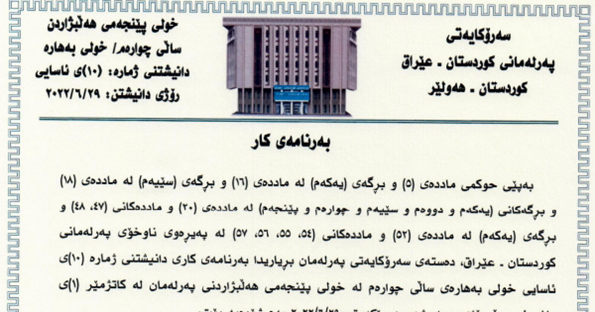 The Speaker of the Kurdistan Parliament Dr. Rewaz Faiq calls MPs to a sitting on Wednesday 29th June 2022 at 1pm, the 10th ordinary sitting of the spring session of the fourth year of the fifth term of Parliament. The Presidency of Parliament announces the order of business of the sitting as follows: