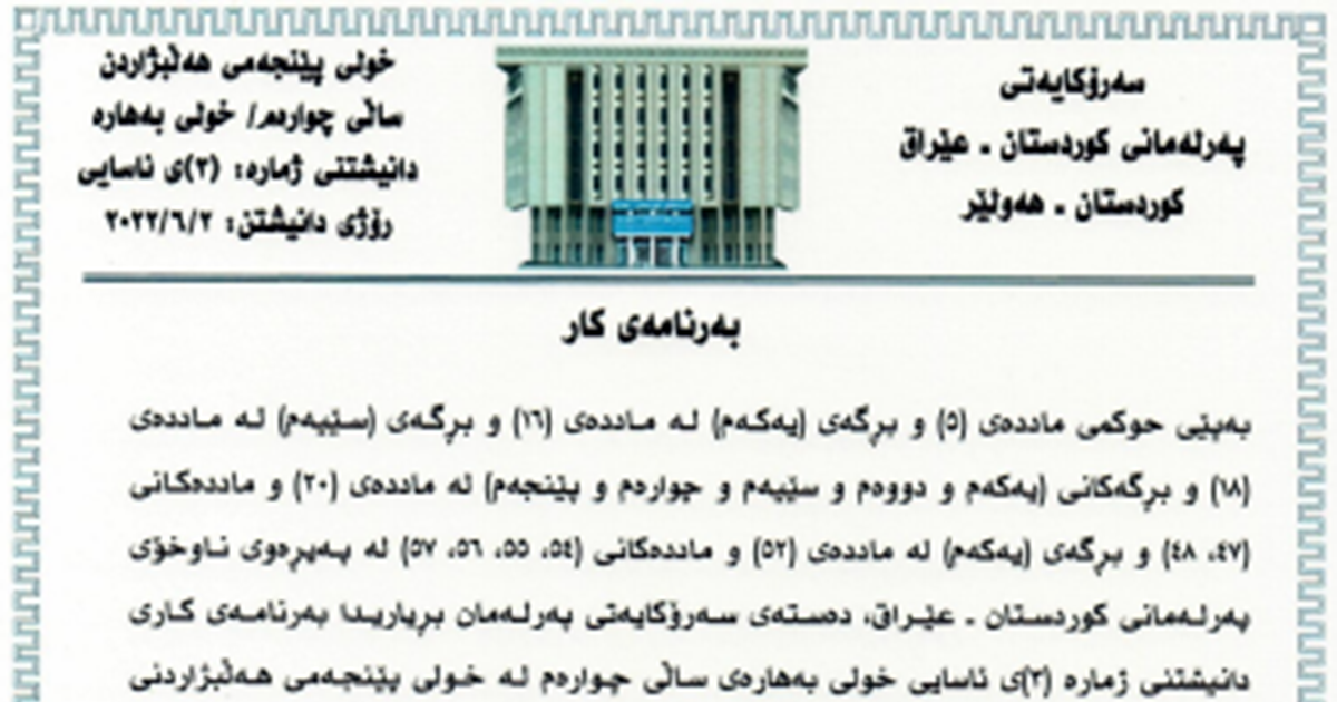 The Speaker of the Kurdistan Parliament Dr. Rewaz Faiq calls MPs to a sitting on Thursday 2nd June 2022 at 12 noon, the third ordinary sitting of the spring session of the fourth year of the fifth term of Parliament. The Presidency of Parliament announces the order of business of the sitting as follows: