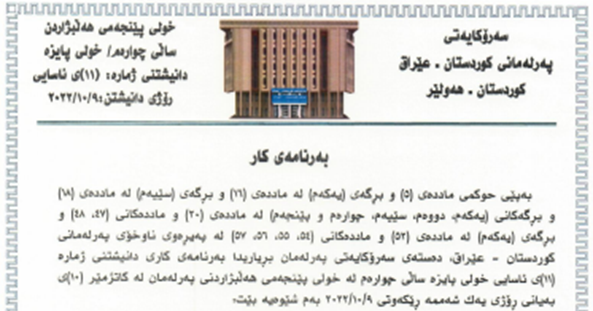 The Speaker of the Kurdistan Parliament Dr. Rewaz Faiq calls MPs to a sitting on Sunday 9th October 2022 at 10am, the 11th ordinary sitting of the autumn session of the fourth year of the fifth term of Parliament. The Presidency of Parliament announces the order of business of the sitting as follows: