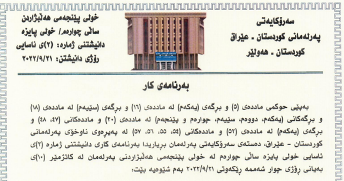The Speaker of the Kurdistan Parliament Dr. Rewaz Faiq calls MPs to a sitting on Wednesday 21st September 2022 at 10am, the second ordinary sitting of the autumn session of the fourth year of the fifth term of Parliament. The Presidency of Parliament announces the order of business of the sitting as follows: