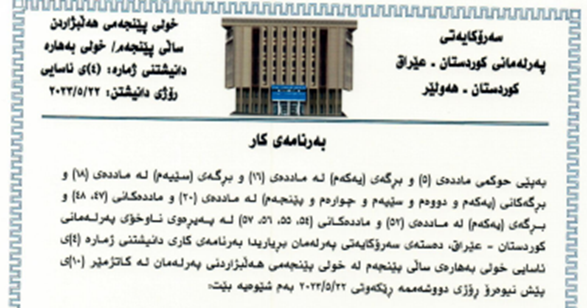 The Speaker of the Kurdistan Parliament Dr. Rewaz Faiq calls MPs to a sitting on Monday 22nd May 2023 at 10am, the fourth ordinary sitting of the spring session of the fifth year of the fifth term of Parliament. The Presidency of Parliament announces the order of business of the sitting as follows:
