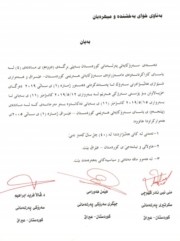 لە بەیاننامەیەكدا سەرۆكایەتی پەرلەمانی كوردستان رایگەیاند كە دەرگای خۆپاڵاوتن بۆ پۆستی سەرۆكی هەرێمی كوردستان لە كاتژمێر (11) ی پێشنیوەرۆی ئەمڕۆەوە 15/5/2019 دادەخرێت.