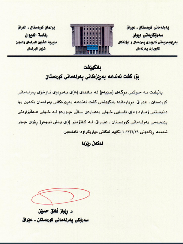 پاڵپشت به حوكمی بڕگهی (سێیهم) له ماددهی (١٨)ی پهیڕهوی ناوخۆی پهرلهمانی كوردستان ـ عێراق، بڕیارماندا بانگهێشتی گشت ئهندامه بهڕێزهكانی پهرلهمان بكهین بۆ دانیشتنی ژماره (١٠)ی ئاسایی خولی بەهارەی ساڵی چوارەم له خولی ههڵبژاردنی پێنجهمی پهرلهمانی كوردستان ـ عێراق، له كاتژمێر (١)ی پاش نیوەڕۆ ڕۆژی چوار شەممە ڕێكهوتی ٢٠٢٢/٦/٢٩ تكایه لهكاتی دیاریكراودا ئامادهبن.