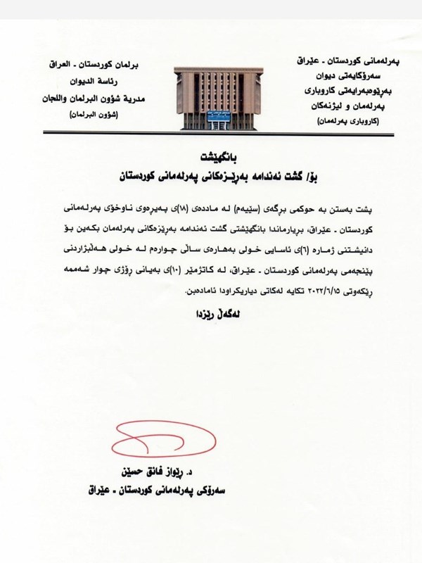 پشت بهستن به حوكمی بڕگهی (سێیهم) له ماددهی (١٨)ی پهیڕهوی ناوخۆی پهرلهمانی كوردستان ـ عێراق، بڕیارماندا بانگهێشتی گشت ئهندامه بهڕێزهكانی پهرلهمان بكهین بۆ دانیشتنی ژماره (٦)ی ئاسایی خولی بەهارەی ساڵی چوارەم له خولی ههڵبژاردنی پێنجهمی پهرلهمانی كوردستان ـ عێراق، له كاتژمێر (١٠)ی بەیانی ڕۆژی چوار شەممە ڕێكهوتی ٢٠٢٢/٦/١٥ تكایه لهكاتی دیاریكراودا ئامادهبن.