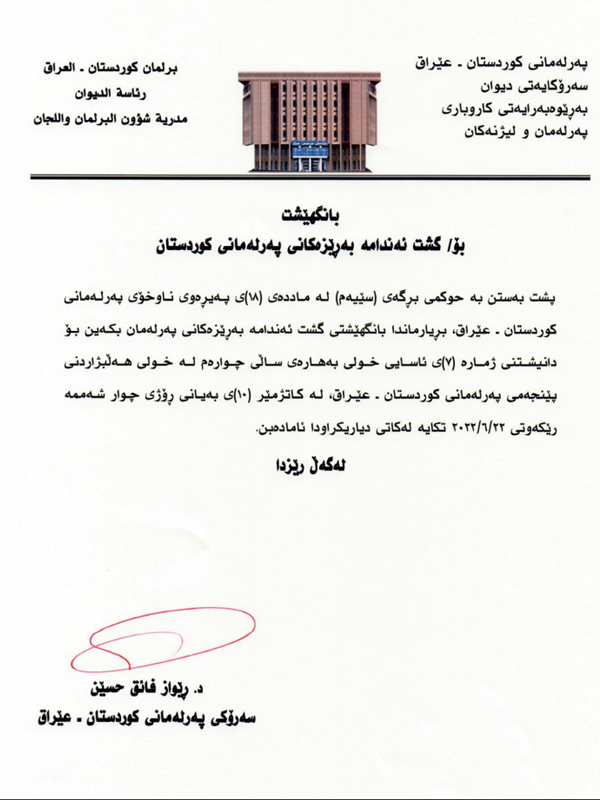 پشت بهستن به حوكمی بڕگهی (سێیهم) له ماددهی (١١)ی پهیڕهوی ناوخۆی پهرلهمانی كوردستان ـ عێراق، بڕیارماندا بانگهێشتی گشت ئهندامه بهڕێزهكانی پهرلهمان بكهین بۆ دانیشتنی ژماره (٧)ی ئاسایی خولی بەهارەی ساڵی چوارەم له خولی ههڵبژاردنی پێنجهمی پهرلهمانی كوردستان ـ عێراق، له كاتژمێر (١٠)ی بەیانی ڕۆژی چوار شەممە رێكهوتی ٢٠٢٢/٦/٢٢ تكایه لهكاتی دیاریكراودا ئامادهبن.